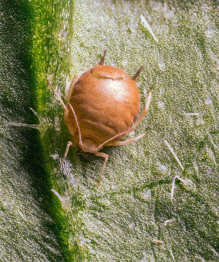 Aphidius colemani has a very effective searching behaviour, which enables the wasps to track down and parasitize aphids, even when they are at low density. The behaviour of the female during egg-laying is typical of the Aphidiidae. First the host is examined by drumming with the antennae. This gives the wasp the information about whether the aphid is the right species, and whether it has not been parasitized before. If both criteria are met, then the second phase of parasitization will start. The female stands on outstretched legs and bends her abdomen forward beneath the thorax and between her legs. By moving her abdomen forward, she pierces the aphid with her ovipositor and deposits an egg. All this happens in less than half a second. Apart from the parasitization itself, the disturbance of the aphid population by the presence of the parasitic wasp also has an effect: the alarmed aphids secrete a warning substance, which affects the entire population, often causing aphids to drop from the leaf and fall to the ground. Although many aphids die as a result, many will survive and migrate to other plants to begin new colonies. To avoid becoming covered in their secretions, the parasite will not readily enter very dense aphid colonies.