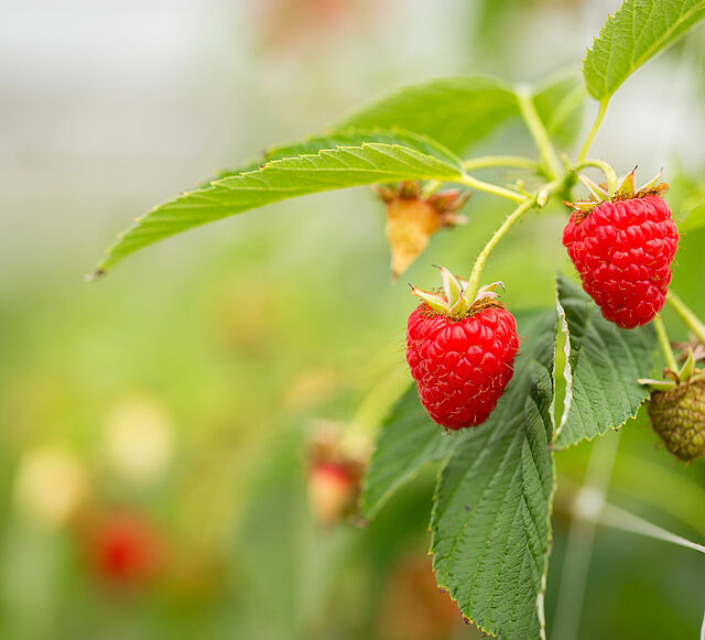 The fruit of the raspberry plant is red, tasty and sweet but tart-flavoured. Raspberries are a seasonal fruit and produced in summer or early autumn. Botanically speaking, the raspberry is not a berry, but an aggregate fruit of numerous drupelets around a central core.