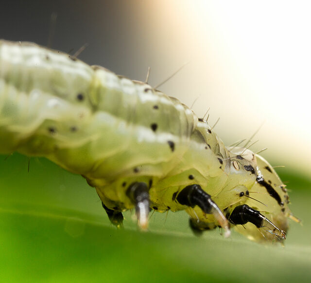 Caterpillars are the larvae of butterflies and moths. Butterflies and moths form the order Lepidoptera, a very large group with more than 150,000 species, that are easily distinguishable from other insects. Many of the butterfly species that are active during the day can be strikingly colourful while moth flying at night are usually inconspicuously brownish are greyish. Adult butterflies do not damage crops. Most of them feed on nectar. In contrast, the caterpillars have biting and chewing mouthparts and can devour large amounts of plant tissue. Many species cause damage to crops.