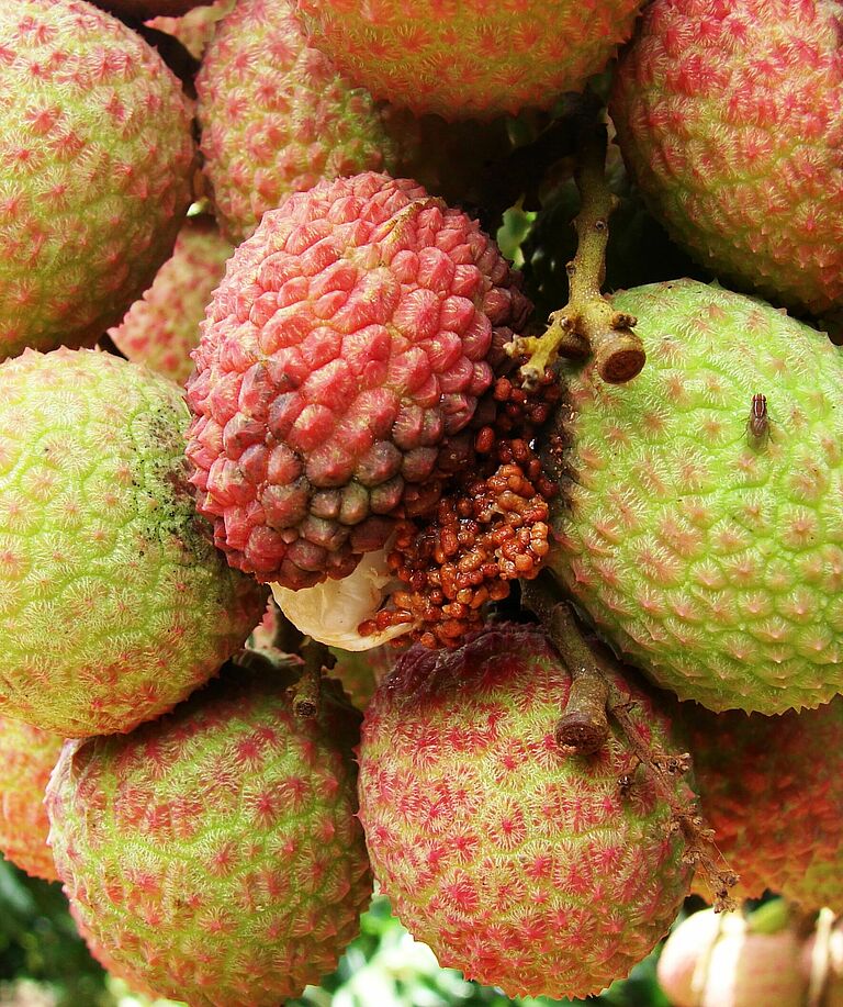 The newly hatched larva penetrates the litchi fruit and feeds its way through the fruit flesh and into the seed. Such feeding causes fungal growth and other infestations leading to fruit rot. Larva activity is detected by the presence of brown granular excreta on the fruit surface.