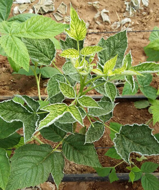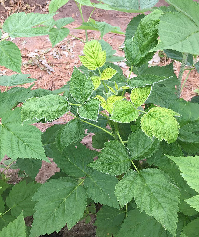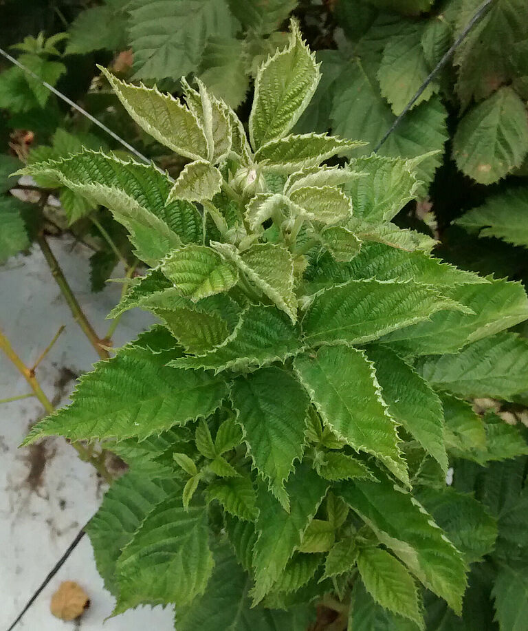 Leaf feeding is mainly concentrated on the underside near the leaf stalk, which tends to cause the leaf to turn brown and curl up. A typical indication of an attack of broad mite (Polyphagotarsonemus latus), is the appearance of dark brown edges at the base of young leaves. In case of a mild infestation, one can often see brown, frequently collapsed spots, or brown stripes forming a fine network on the leaves. In case of a more serious infestation, this network becomes so dense that there is no more green tissue visible. In most cases, the main veins are untouched, causing them to stand out as a green pattern against the brown leaf tissue. Brown, corky patches can appear on the leaf stalks and main stems.