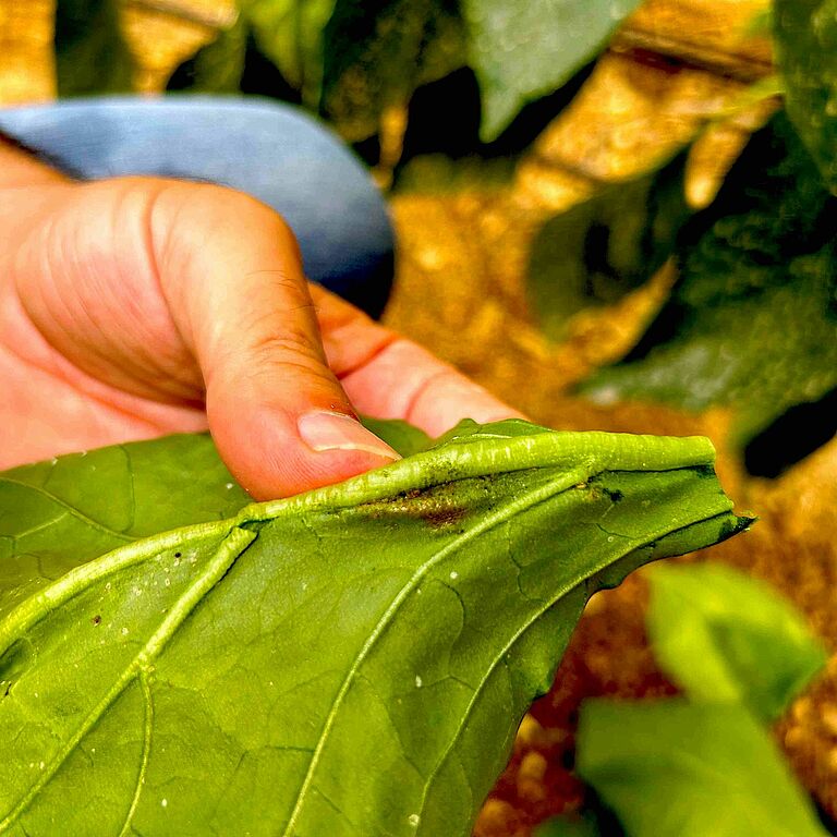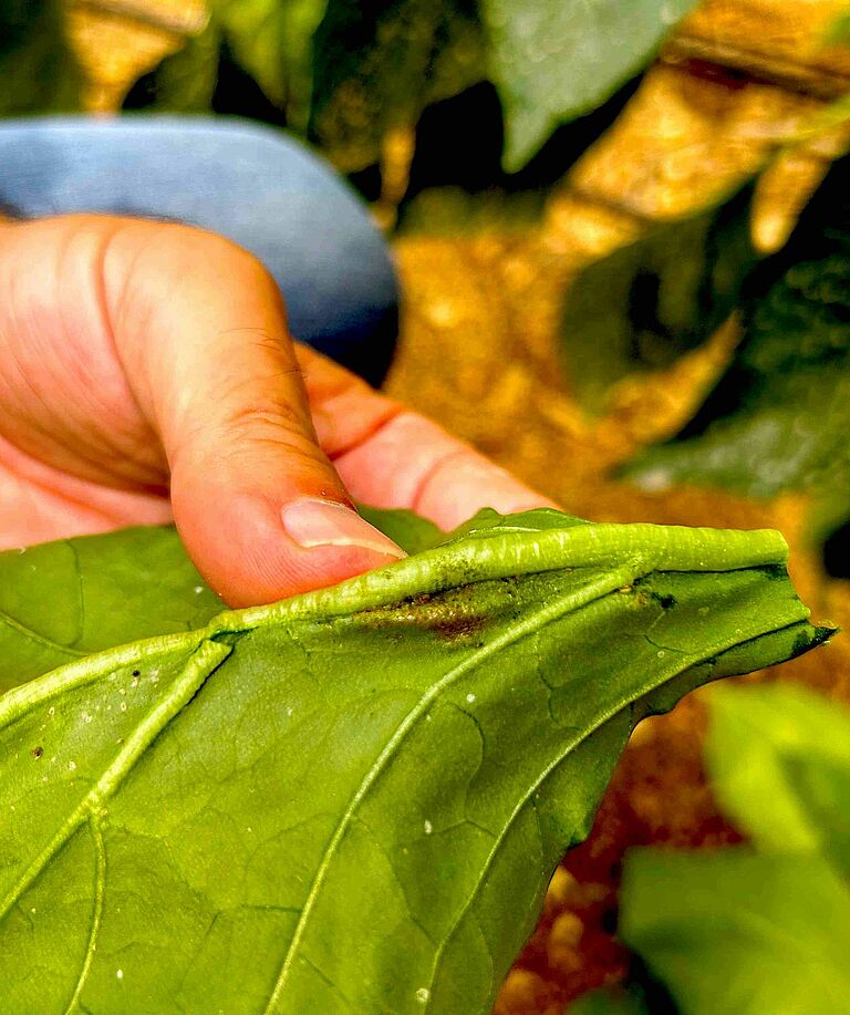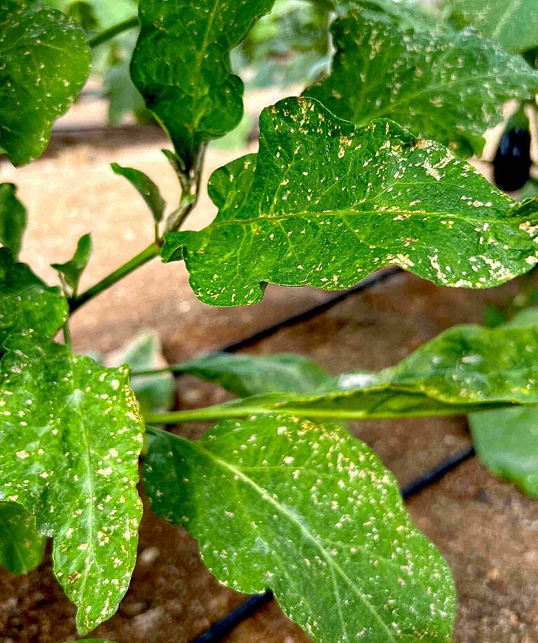 At higher infestation levels, the damage caused by Thrips parvispinus becomes even more severe. Leaves may develop a burned or scorched appearance due to extensive feeding and damage to the leaf tissue. This not only compromises the aesthetic quality of the plant but also diminishes its vitality and productivity, potentially leading to reduced yields.