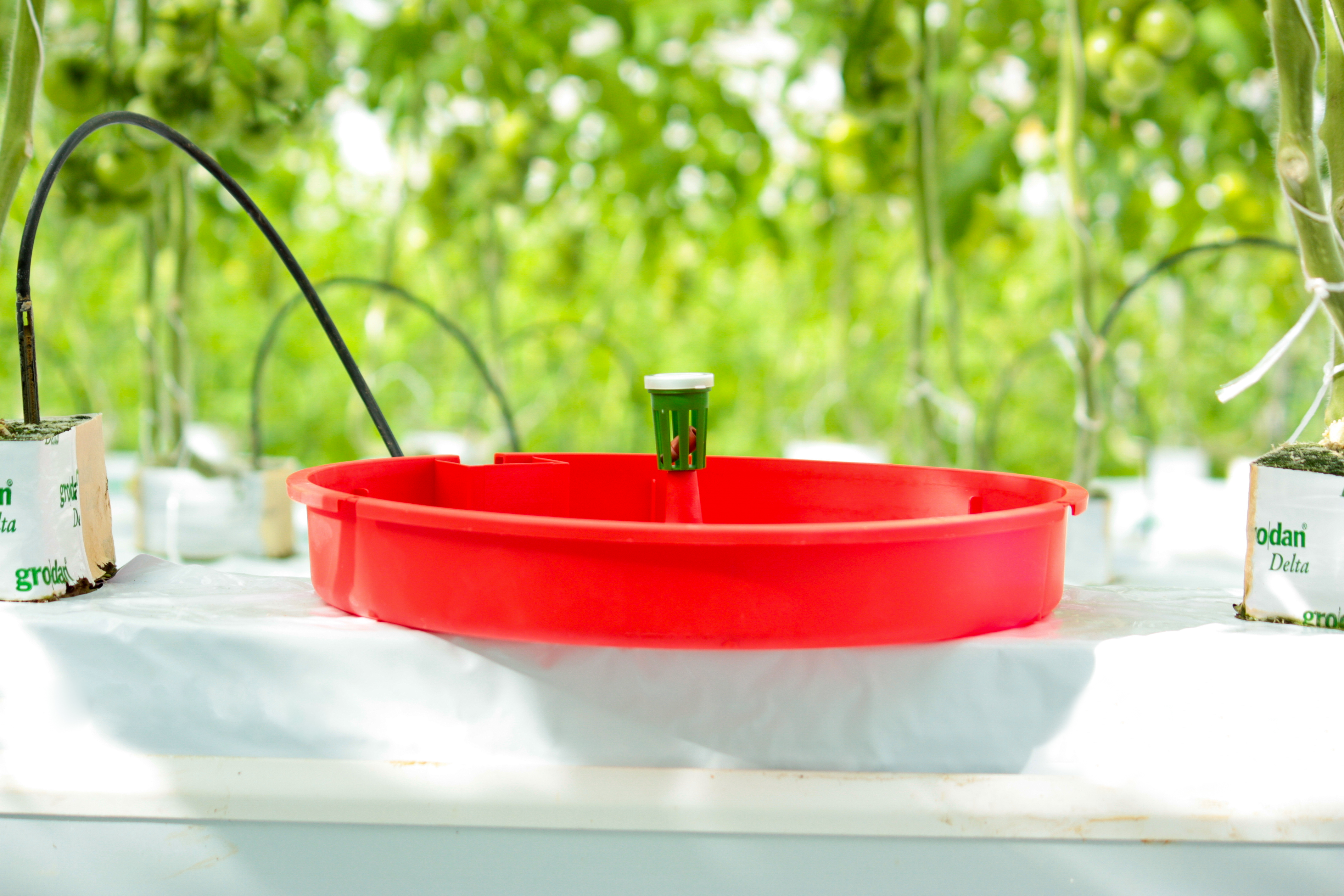 Use the Tutasan trap for monitoring and trapping male tomato leaf miner moths in combination with Pherodis Tuta absoluta.